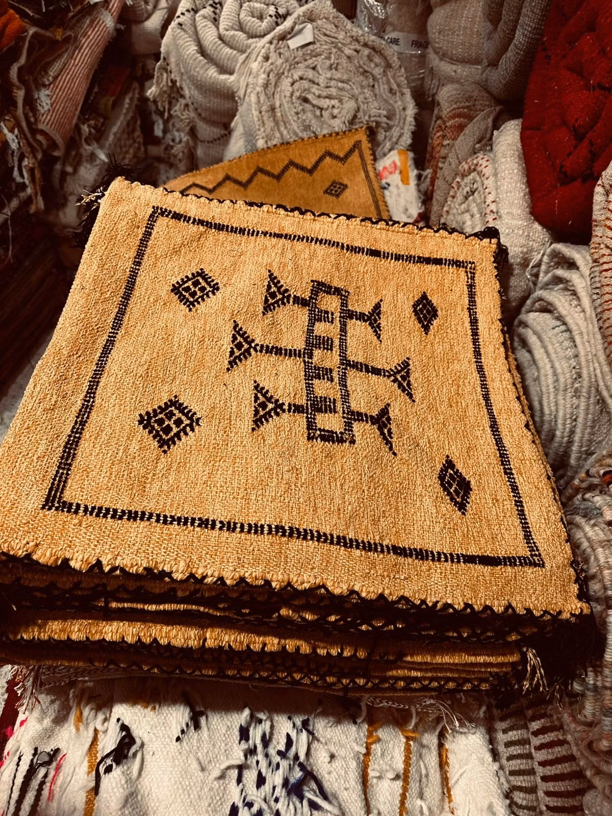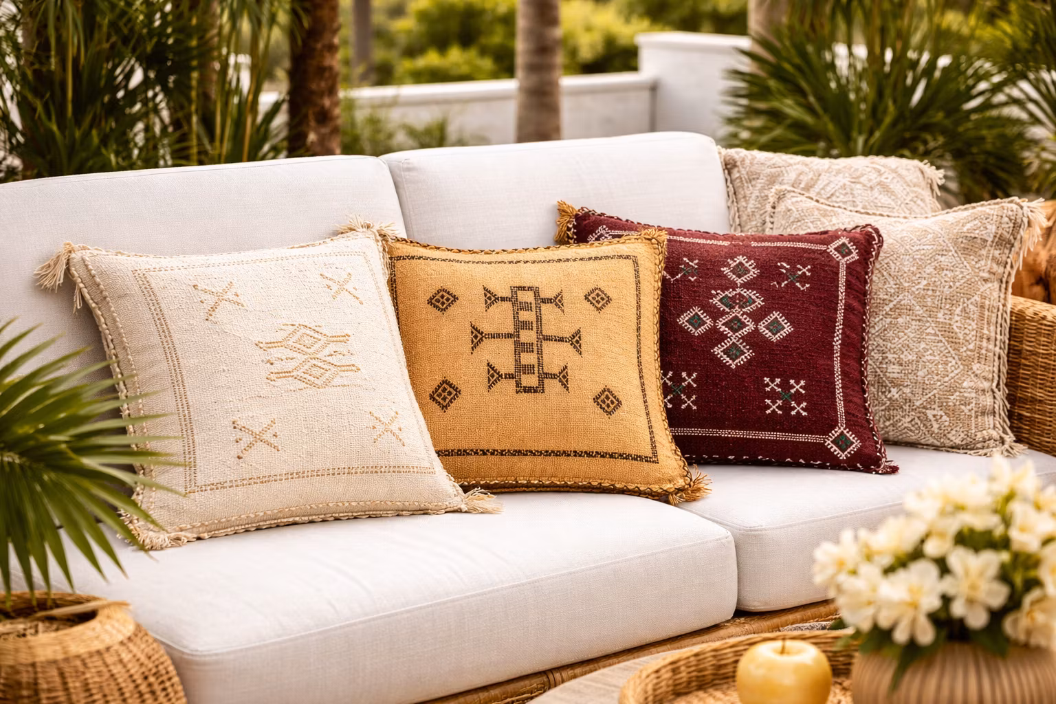 Handvävda kuddfodral i kaktussilke, framställda av agavefibrer från Marockos Sahara.