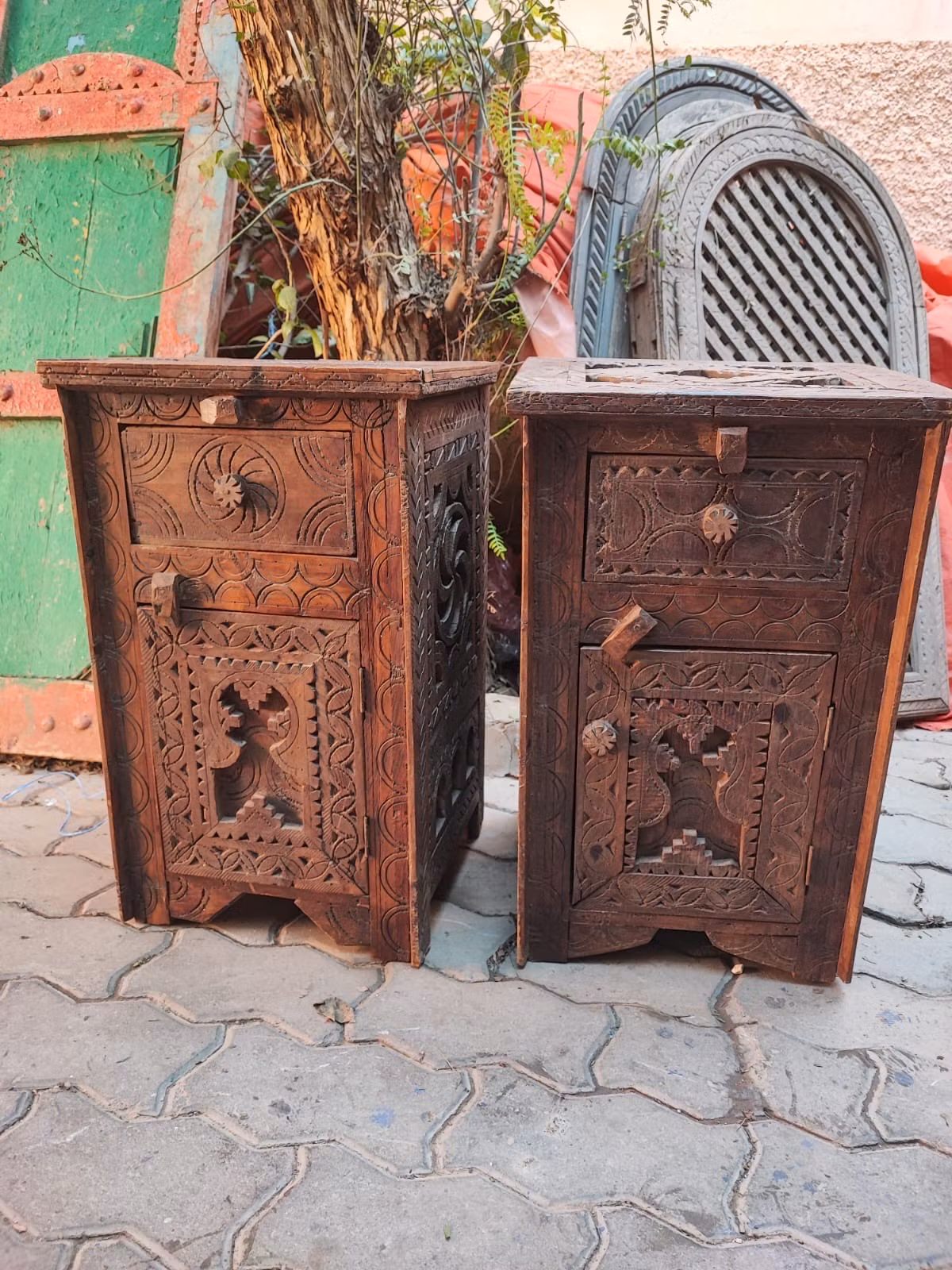Handsnidade träskåp med ursprung i Marocko.