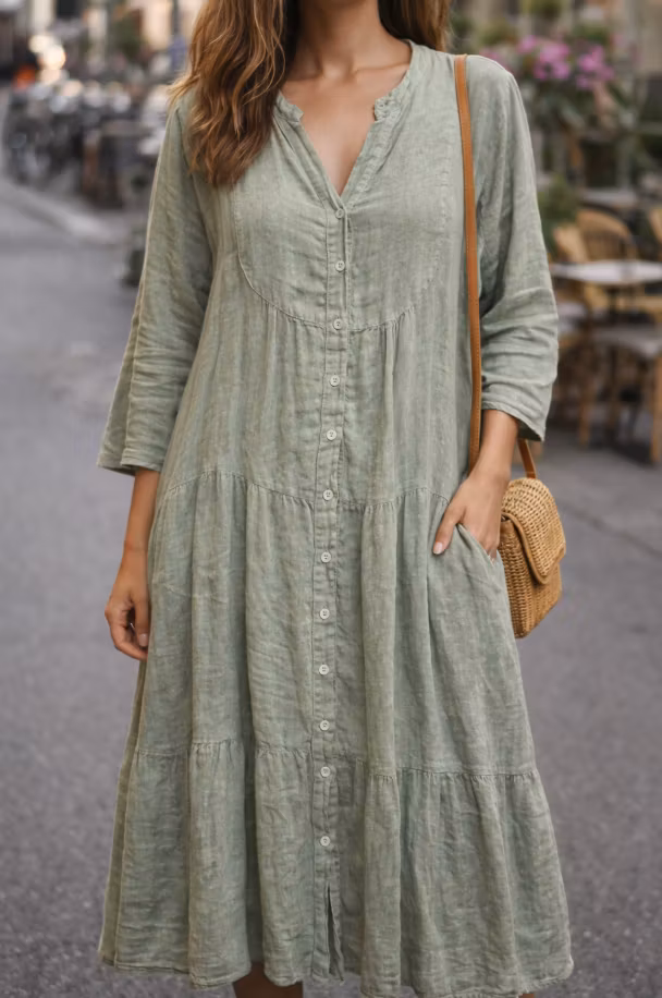 Klänning i vackert grönt 100% lin. Knappar fram och ärmarna med liten trumpetärm och fickor vid sidorna.