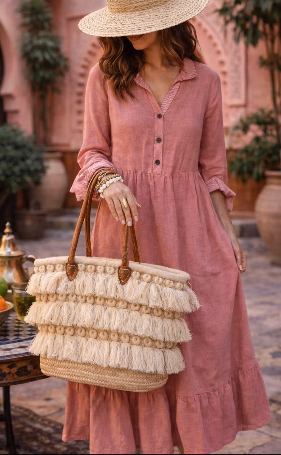 Följ med trenden och omfamna enkel elegans med denna vackra linne maxiklänning. Den feminin V-ringningen och knappslutningen längs fronten ger en vacker, sofistikerad silhuett, medan de praktiska fickorna med en randig insida matchande klänningens färg tillför en subtil men stilfull detalj. Ärmarna kan justeras och knäppas upp för en mer avslappnad look, och den randiga insidan syns även här som en fin accent. Klänningen levereras med ett matchande linneskärp som framhäver din midja, men bärs lika vackert utan för en mer ledig, flödande känsla.